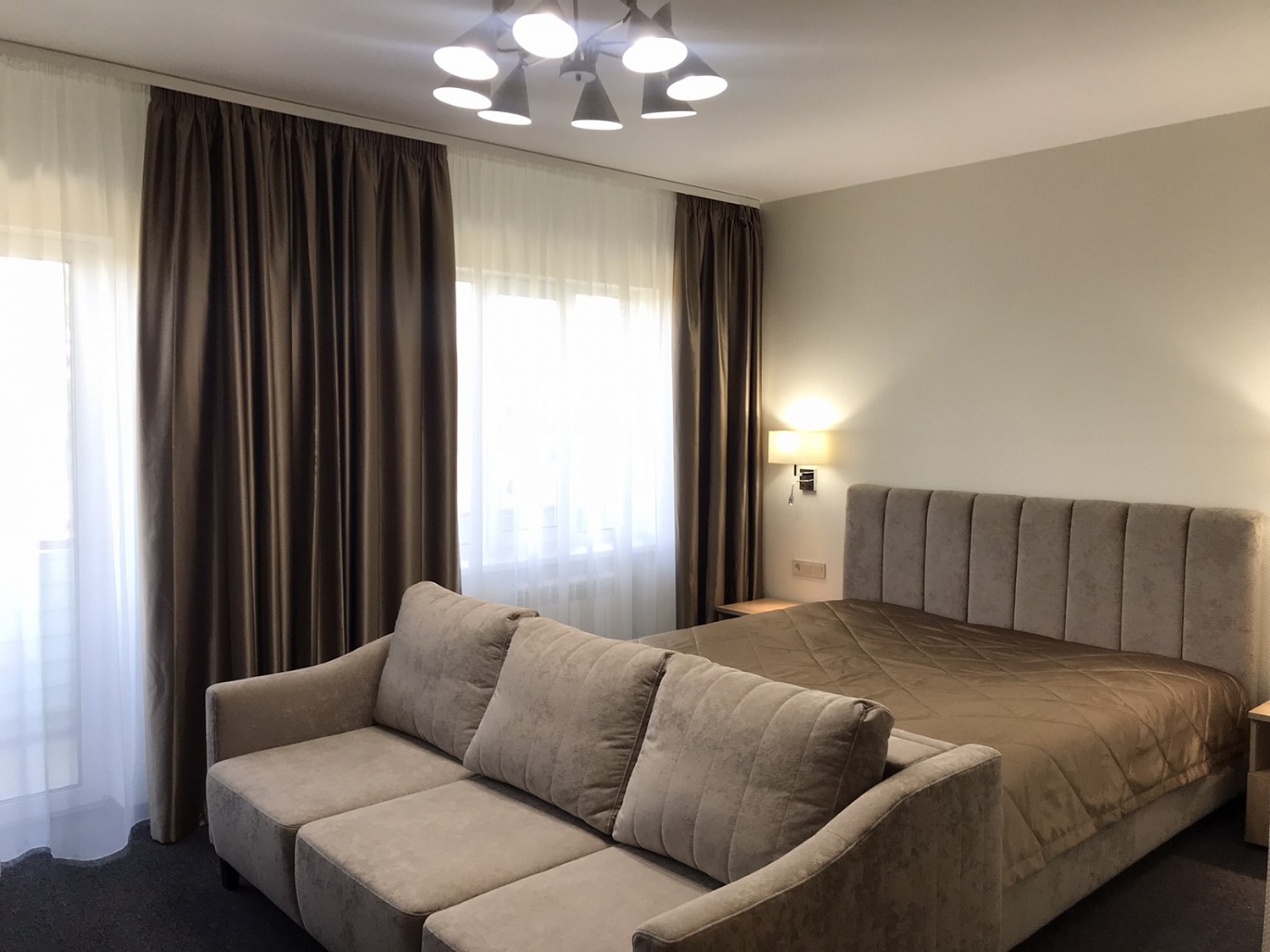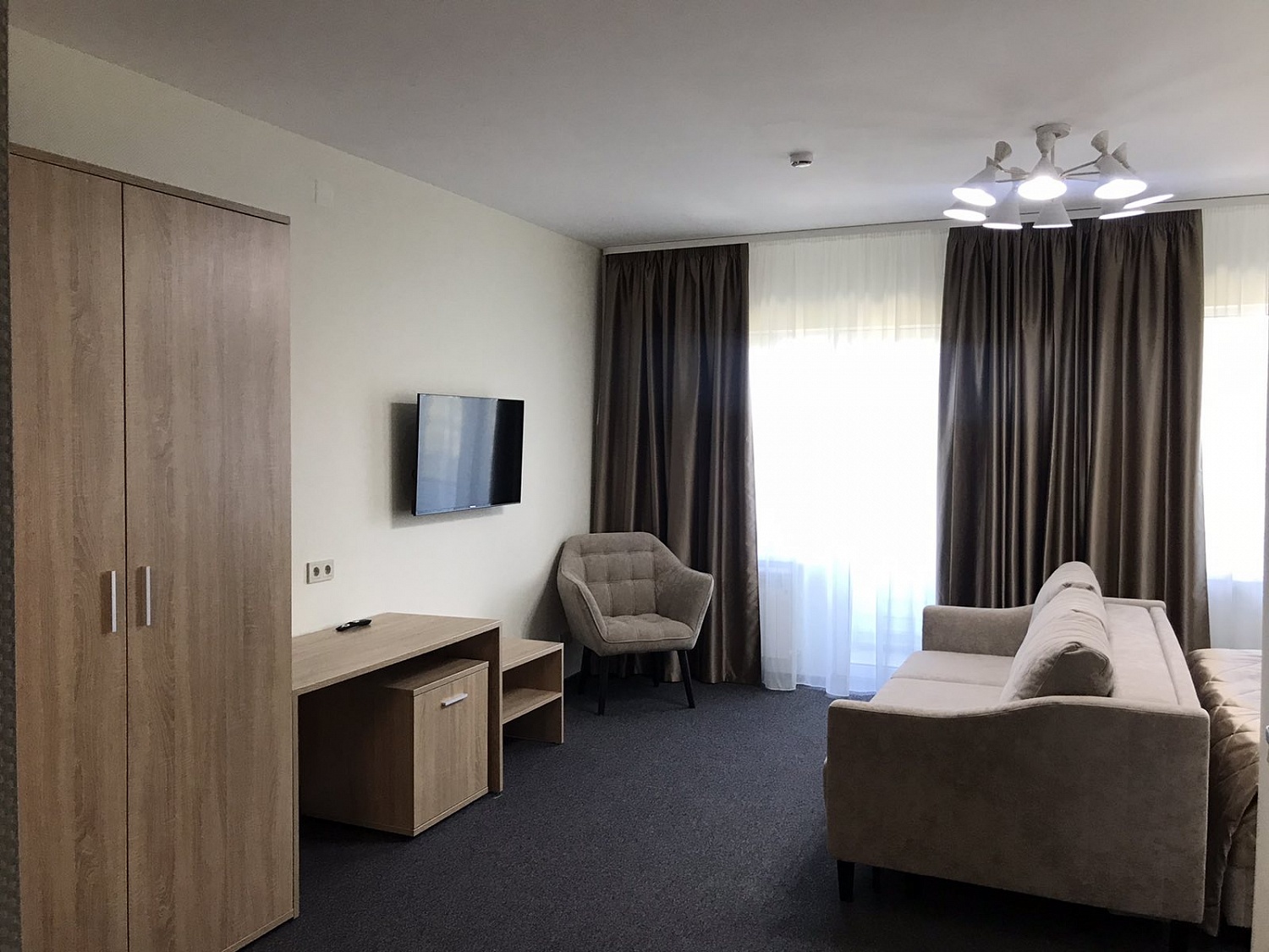Наличие в номере: телевизор 1 ед., холодильник, фен, электрочайник, утюг, гладильная доска, группа обеденной зоны (стол, стулья), письменный стол, 2-спальная кровать, прикроватные тумбочки, набор мягкой мебели, шкаф, набор посуды